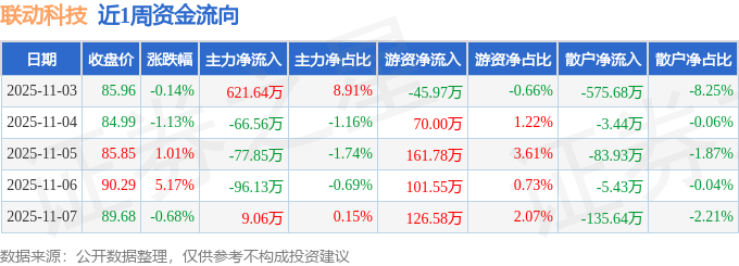 资金流向数据方面,本周联动科技主力资金合计净流入390.17万元,游资资金合计净流入413.95万元,散户资金合计净流出804.12万元。本周资金流向一览见下表: