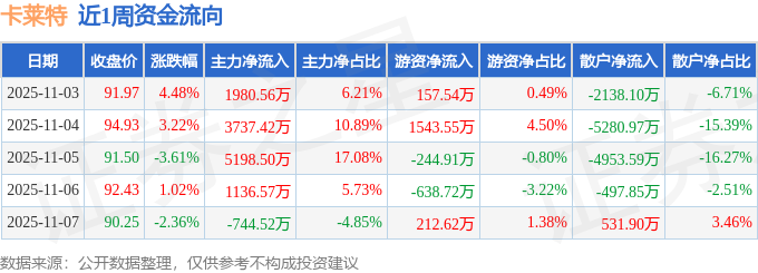 资金流向数据方面,本周卡莱特主力资金合计净流入1.13亿元,游资资金合计净流入1030.08万元,散户资金合计净流出1.23亿元。本周资金流向一览见下表: