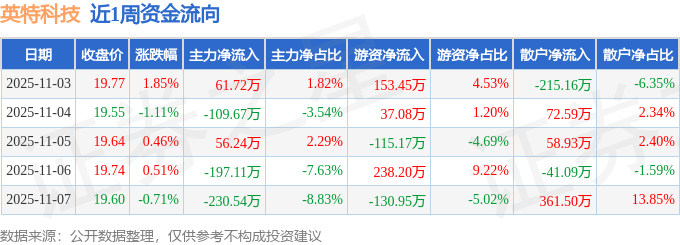 资金流向数据方面,本周英特科技主力资金合计净流出419.36万元,游资资金合计净流入182.6万元,散户资金合计净流入236.76万元。本周资金流向一览见下表:
