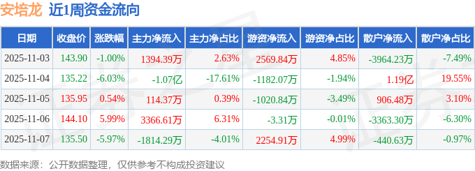 资金流向数据方面,本周安培龙主力资金合计净流出7667.69万元,游资资金合计净流入2618.54万元,散户资金合计净流入5049.16万元。本周资金流向一览见下表: