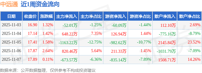 资金流向数据方面,本周中远通主力资金合计净流出420.11万元,游资资金合计净流出1539.59万元,散户资金合计净流入1959.7万元。本周资金流向一览见下表:
