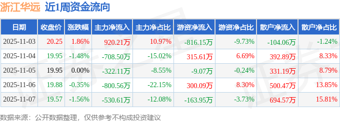资金流向数据方面,本周浙江华远主力资金合计净流出1441.58万元,游资资金合计净流出373.47万元,散户资金合计净流入1815.05万元。本周资金流向一览见下表: