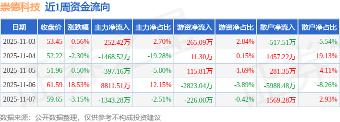 资金流向数据方面,本周崇德科技主力资金合计净流入5854.98万元,游资资金合计净流出2656.84万元,散户资金合计净流出3198.14万元。本周资金流向一览见下表: