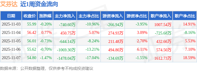 资金流向数据方面,本周艾芬达主力资金合计净流出3481.32万元,游资资金合计净流入579.58万元,散户资金合计净流入2901.74万元。本周资金流向一览见下表: