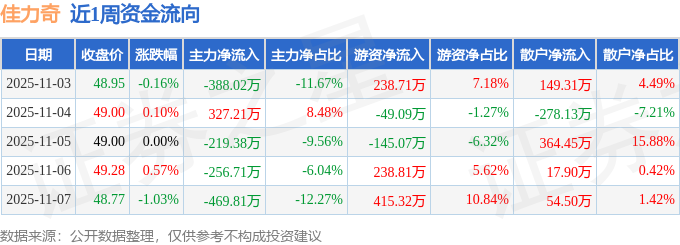 资金流向数据方面,本周佳力奇主力资金合计净流出1006.7万元,游资资金合计净流入698.68万元,散户资金合计净流入308.02万元。本周资金流向一览见下表: