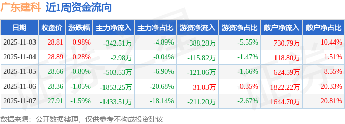 资金流向数据方面,本周广东建科主力资金合计净流出4135.78万元,游资资金合计净流出805.33万元,散户资金合计净流入4941.11万元。本周资金流向一览见下表: