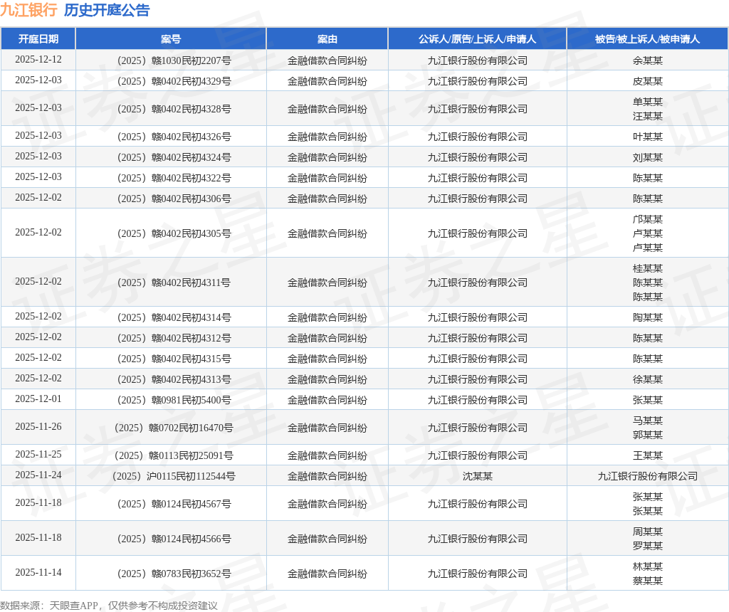 案号:(2025)赣0402民初3621号根据统计,近一年内以九江银行股份有限公司为当事人的历史开庭公告有794则,其中案由为“金融借款合同纠纷”的公告以706则居首,其次为“借款”有66则,“房屋买卖合同纠纷”有6则。历史开庭公告(前20条)如下: