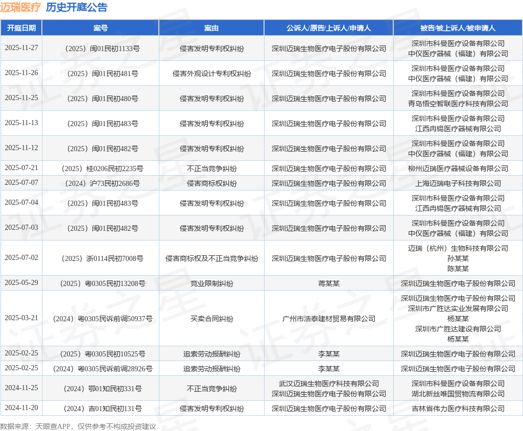 案号:(2025)闽01民初482号根据统计,近一年内以深圳迈瑞生物医疗电子股份有限公司为当事人的历史开庭公告有16则,其中案由为“侵害发明专利权纠纷”的公告以7则居首,其次为“不正当竞争纠纷”有2则,“追索劳动报酬纠纷”有2则。历史开庭公告如下: