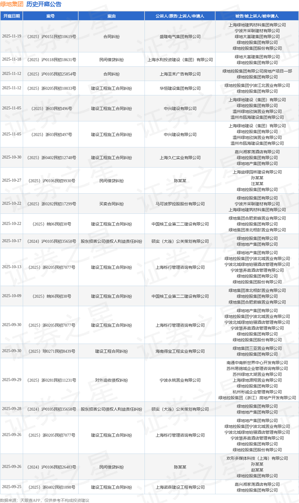 案号:(2025)沪0105民初25854号根据统计,近一年内以绿地控股集团有限公司为当事人的历史开庭公告有201则,其中案由为“建设工程施工合同纠纷”的公告以37则居首,其次为“金融借款合同纠纷”有24则,“合同纠纷”有19则。历史开庭公告(前20条)如下: