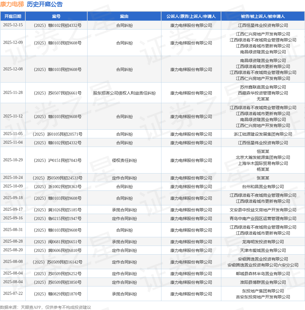 案号:(2025)赣0103民初9608号根据统计,近一年内以康力电梯股份有限公司为当事人的历史开庭公告有175则,其中案由为“定作合同纠纷”的公告以68则居首,其次为“买卖合同纠纷”有34则,“承揽合同纠纷”有30则。历史开庭公告(前20条)如下: