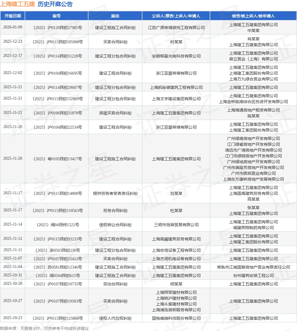 案号:(2025)沪0115民初93233号根据统计,近一年内以上海建工五建集团有限公司为当事人的历史开庭公告有298则,其中案由为“建设工程施工合同纠纷”的公告以59则居首,其次为“建设工程分包合同纠纷”有56则,“劳务合同纠纷”有35则。历史开庭公告(前20条)如下: