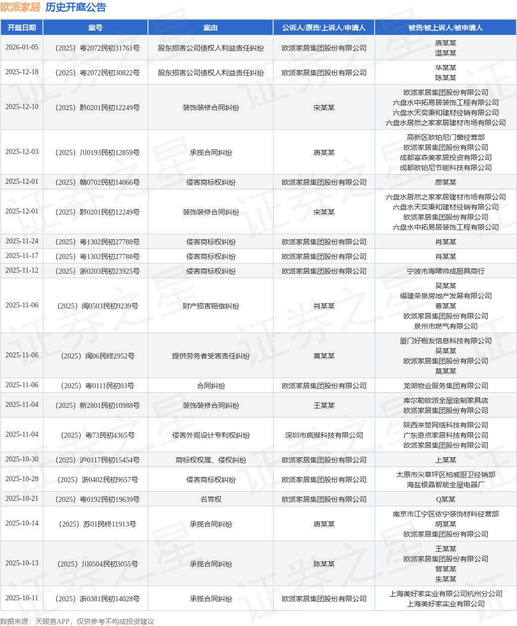 案号:(2025)浙0203民初23925号根据统计,近一年内以欧派家居集团股份有限公司为当事人的历史开庭公告有286则,其中案由为“侵害商标权纠纷”的公告以66则居首,其次为“承揽合同纠纷”有54则,“买卖合同纠纷”有51则。历史开庭公告(前20条)如下: