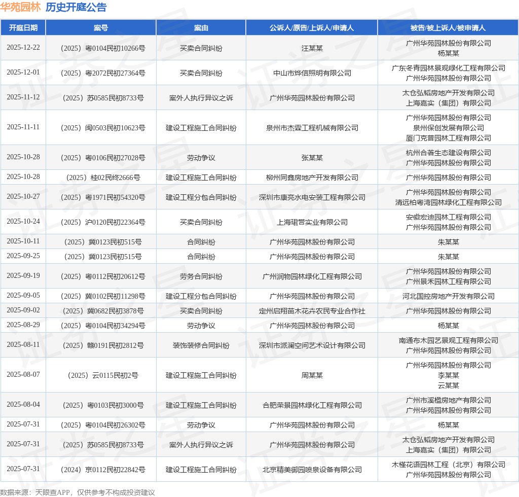 案号:(2025)苏0585民初8733号根据统计,近一年内以广州华苑园林股份有限公司为当事人的历史开庭公告有106则,其中案由为“建设工程施工合同纠纷”的公告以39则居首,其次为“买卖合同纠纷”有15则,“建设工程分包合同纠纷”有12则。历史开庭公告(前20条)如下: