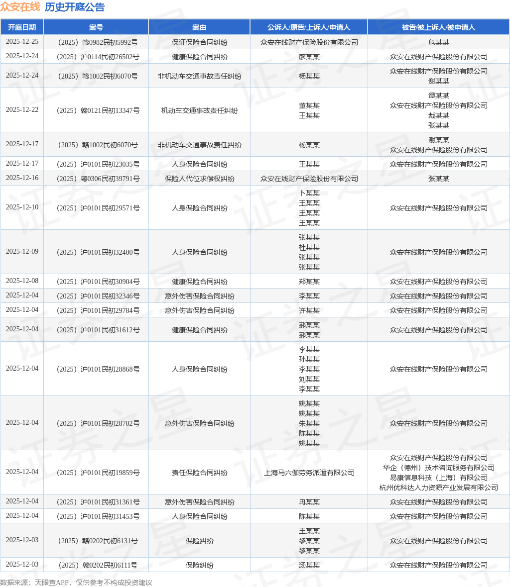 案号:(2025)沪0101民初28362号根据统计,近一年内以众安在线财产保险股份有限公司为当事人的历史开庭公告有4854则,其中案由为“保证保险合同纠纷”的公告以3165则居首,其次为“人身保险合同纠纷”有662则,“保险人代位求偿权纠纷”有288则。历史开庭公告(前20条)如下: