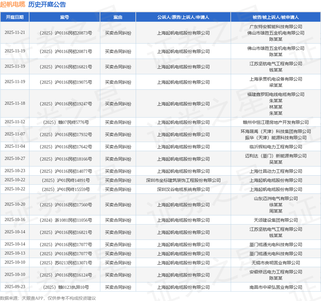 案号:(2025)赣07民终5776号根据统计,近一年内以上海起帆电缆股份有限公司为当事人的历史开庭公告有111则,其中案由为“买卖合同纠纷”的公告以98则居首,其次为“合同纠纷”有4则,“产品责任纠纷”有3则。历史开庭公告(前20条)如下: