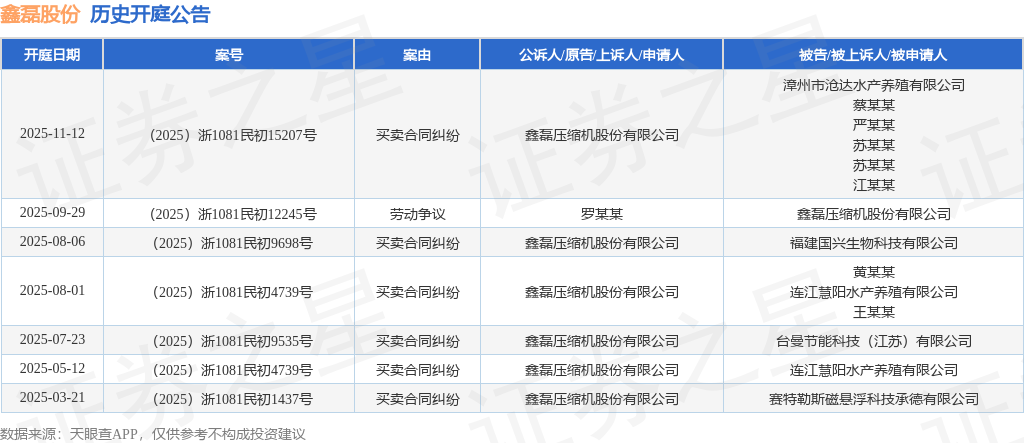 根据统计,近一年内以鑫磊压缩机股份有限公司为当事人的历史开庭公告有7则,其中案由为“买卖合同纠纷”的公告以6则居首,其次为“劳动争议”有1则。历史开庭公告如下: