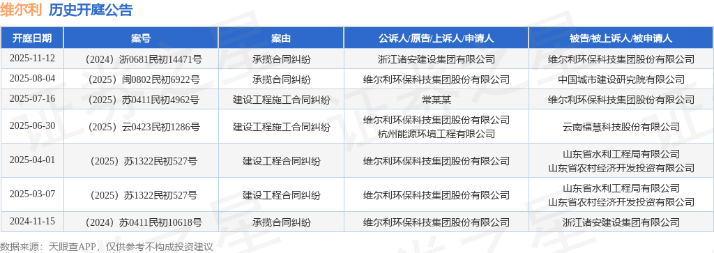 案号:(2024)浙0681民初14471号根据统计,近一年内以维尔利环保科技集团股份有限公司为当事人的历史开庭公告有7则,其中案由为“承揽合同纠纷”的公告以3则居首,其次为“建设工程合同纠纷”有2则,“建设工程施工合同纠纷”有2则。历史开庭公告如下: