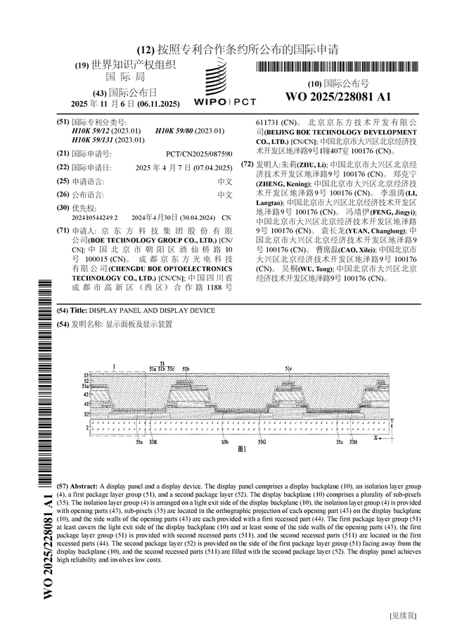 证券之星消息,根据企查查数据显示京东方A(000725)公布了一项国际专利申请,专利名为“显示面板及显示装置”,专利申请号为PCT/CN2025/087590,国际公布日为2025年11月6日。