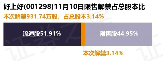 证券之星消息,根据市场公开信息整理,好上好(001298)于11月10日将有931.74万股限售股份解禁,为公司首发原股东限售股份,占公司总股本3.14%。(本次数据根据历史公告整理得出,实际情况以上市公司最新公告为准)最近一年内,该股累计解禁107.79万股,占总股本的0.36%。本次解禁后,公司还有1.33亿股限售股份,占总股本44.95%。具体如下图所示: