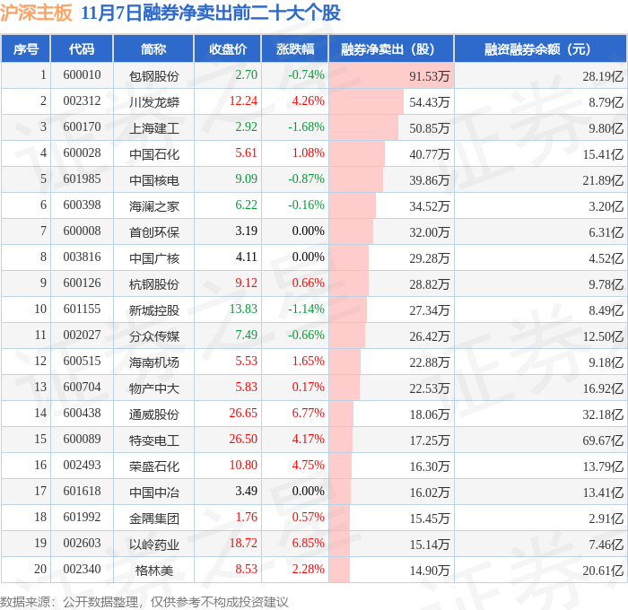 沪深主板融券净卖出前三分别为:包钢股份(600010)融券净卖出91.53万股、川发龙蟒(002312)融券净卖出54.43万股、上海建工(600170)融券净卖出50.85万股,前20具体见下表: