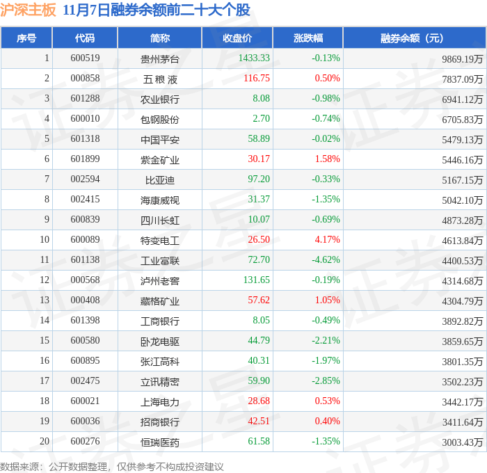 沪深主板融券余额前三分别为:贵州茅台(600519)融券余额9869.19万元、五 粮 液(000858)融券余额7837.09万元、农业银行(601288)融券余额6941.12万元,前20具体见下表:
