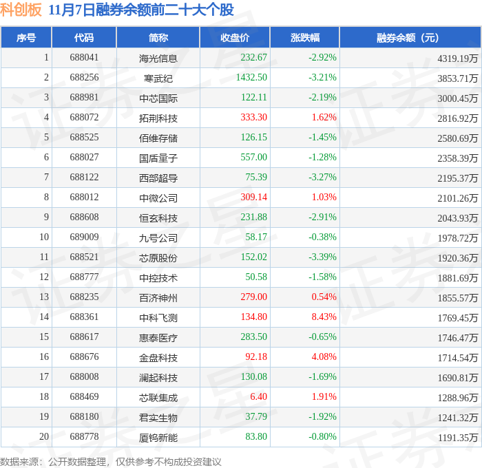 科创板融券余额前三分别为:海光信息(688041)融券余额4319.19万元、寒武纪(688256)融券余额3853.71万元、中芯国际(688981)融券余额3000.45万元,前20具体见下表: