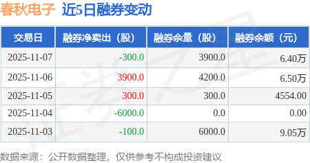 证券之星消息,11月7日,春秋电子(603890)融资买入1.32亿元,融资偿还8443.42万元,融资净买入4742.32万元,融资余额3.88亿元。