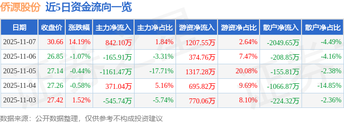 证券之星消息,截至2025年11月7日收盘,侨源股份(301286)报收于30.66元,上涨14.19%,换手率9.67%,成交量15.59万手,成交额4.57亿元。