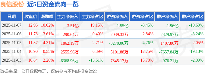 证券之星消息,截至2025年11月7日收盘,良信股份(002706)报收于12.96元,上涨10.02%,涨停,换手率15.81%,成交量144.68万手,成交额18.31亿元。