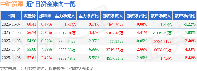 证券之星消息,截至2025年11月7日收盘,中矿资源(002738)报收于60.41元,上涨6.47%,换手率4.87%,成交量34.61万手,成交额20.44亿元。