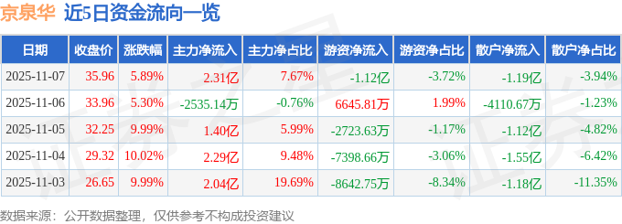 证券之星消息,截至2025年11月7日收盘,京泉华(002885)报收于35.96元,上涨5.89%,换手率36.69%,成交量84.72万手,成交额30.12亿元。