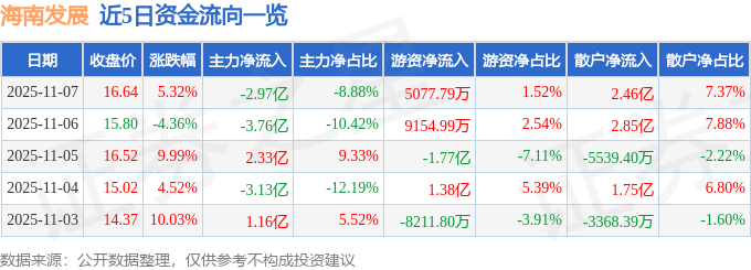 证券之星消息,截至2025年11月7日收盘,海南发展(002163)报收于16.64元,上涨5.32%,换手率24.81%,成交量199.33万手,成交额33.43亿元。
