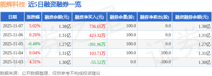 能辉科技融资融券信息显示,融资方面,当日融资买入3327.58万元,融资偿还2590.93万元,融资净买入736.65万元。融券方面,融券卖出0.0股,融券偿还0.0股,融券余量100.0股,融券余额0.28万元。融资融券余额1.38亿元。