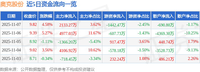 证券之星消息,截至2025年11月7日收盘,奥克股份(300082)报收于9.82元,上涨4.58%,换手率9.01%,成交量61.12万手,成交额5.89亿元。
