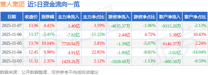 证券之星消息,截至2025年11月7日收盘,雪人集团(002639)报收于13.96元,上涨4.41%,换手率48.13%,成交量313.13万手,成交额43.75亿元。