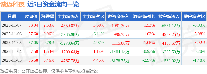 证券之星消息,截至2025年11月7日收盘,诚迈科技(300598)报收于58.94元,上涨2.33%,换手率10.24%,成交量22.21万手,成交额13.01亿元。