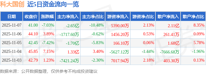 证券之星消息,截至2025年11月7日收盘,科大国创(300520)报收于41.0元,下跌7.03%,换手率21.83%,成交量60.7万手,成交额25.31亿元。