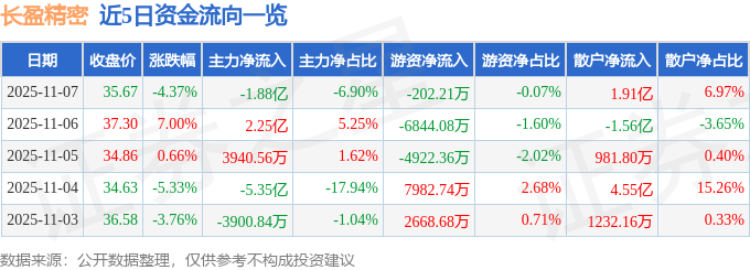 证券之星消息,截至2025年11月7日收盘,长盈精密(300115)报收于35.67元,下跌4.37%,换手率5.59%,成交量75.83万手,成交额27.32亿元。