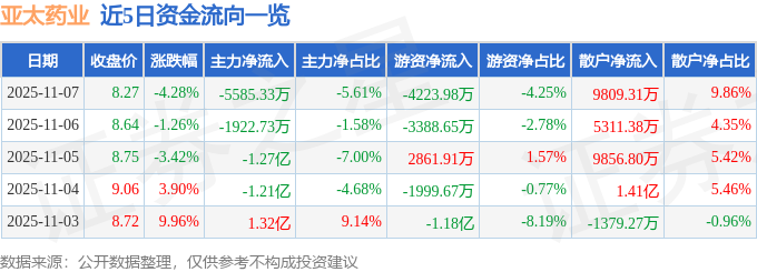 证券之星消息,截至2025年11月7日收盘,亚太药业(002370)报收于8.27元,下跌4.28%,换手率15.94%,成交量118.89万手,成交额9.95亿元。