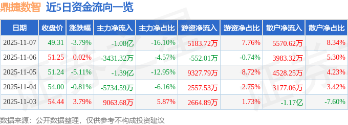证券之星消息,截至2025年11月7日收盘,鼎捷数智(300378)报收于49.31元,下跌3.79%,换手率4.99%,成交量13.44万手,成交额6.68亿元。