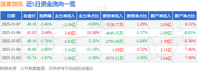 证券之星消息,截至2025年11月7日收盘,通富微电(002156)报收于40.18元,下跌3.46%,换手率3.98%,成交量60.43万手,成交额24.39亿元。