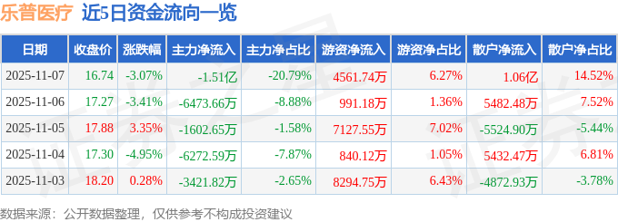 证券之星消息,截至2025年11月7日收盘,乐普医疗(300003)报收于16.74元,下跌3.07%,换手率2.72%,成交量42.98万手,成交额7.27亿元。