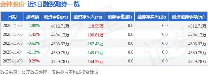 金钟股份融资融券信息显示,融资方面,当日融资买入456.56万元,融资偿还337.97万元,融资净买入118.59万元。融券方面,融券卖出0.0股,融券偿还0.0股,融券余量0.0股,融券余额0.0万元。融资融券余额4612.71万元。