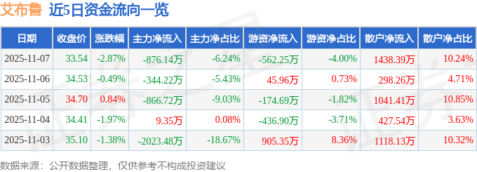 证券之星消息,截至2025年11月7日收盘,艾布鲁(301259)报收于33.54元,下跌2.87%,换手率4.19%,成交量4.14万手,成交额1.4亿元。
