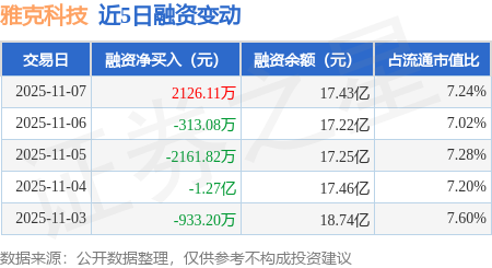 证券之星消息,11月7日,雅克科技(002409)融资买入1.34亿元,融资偿还1.13亿元,融资净买入2126.11万元,融资余额17.43亿元,近20个交易日中有11个交易日出现融资净买入。
