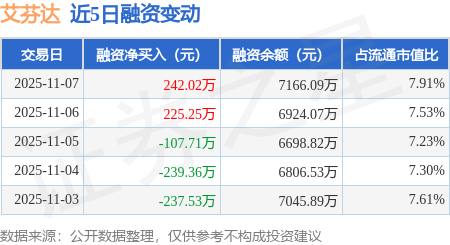 证券之星消息,11月7日,艾芬达(301575)融资买入759.17万元,融资偿还517.15万元,融资净买入242.02万元,融资余额7166.09万元。