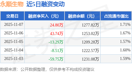 证券之星消息,11月7日,永顺生物(920729)融资买入70.68万元,融资偿还45.88万元,融资净买入24.8万元,融资余额1277.82万元,近20个交易日中有11个交易日出现融资净买入。
