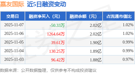 证券之星消息,11月7日,嘉友国际(603871)融资买入953.06万元,融资偿还1003.38万元,融资净卖出50.33万元,融资余额2.02亿元。
