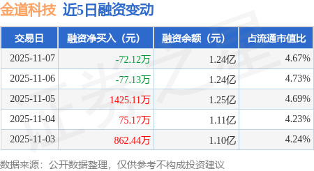 证券之星消息,11月7日,金道科技(301279)融资买入1549.04万元,融资偿还1621.16万元,融资净卖出72.12万元,融资余额1.24亿元。