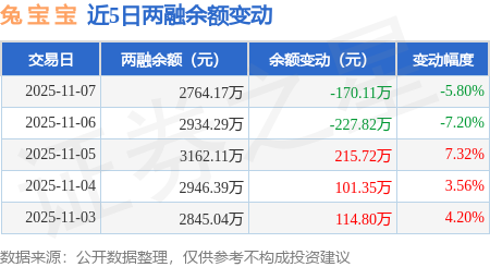 证券之星消息,11月7日,兔 宝 宝(002043)融资买入372.82万元,融资偿还538.13万元,融资净卖出165.31万元,融资余额2613.9万元。